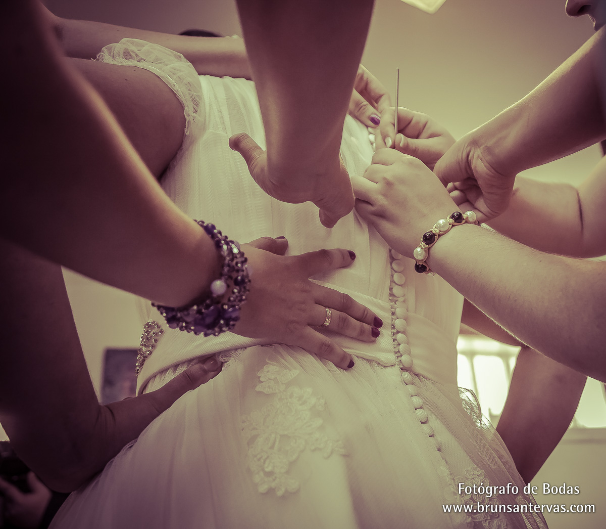 En muchas ocasiones los botones del vestido de novia son un verdadero quebradero de cabeza para la persona que tiene que abotonarlos. Nuestra recomendación es que os llevéis a la persona que os vaya a ayudar ese día a una de las pruebas del vestido. De este modo podrán ver bien cómo se hace y preguntar cualquier duda.